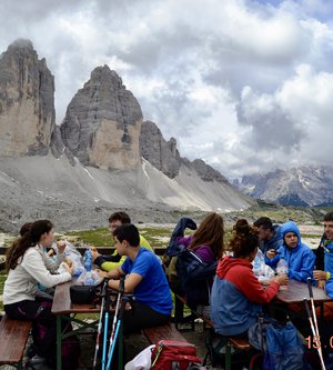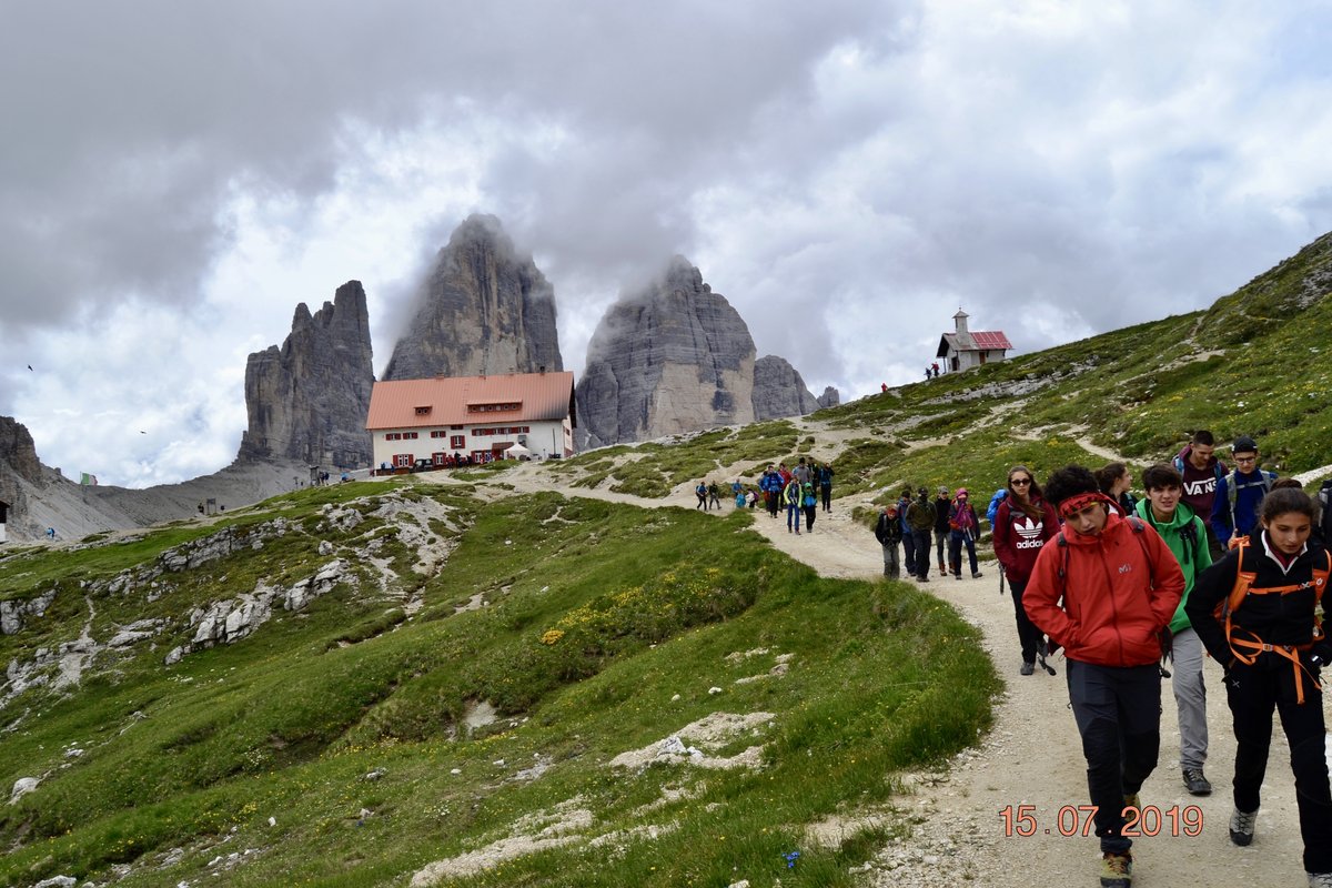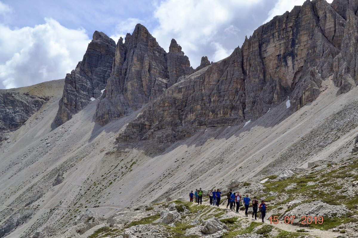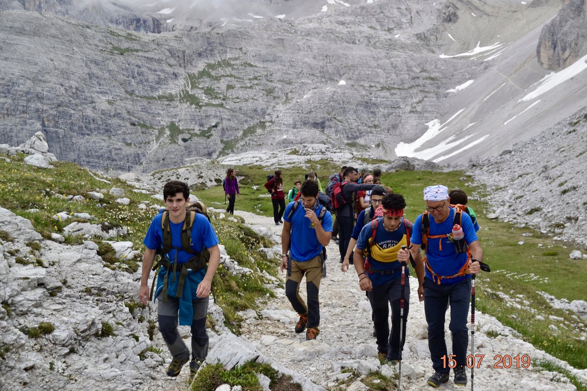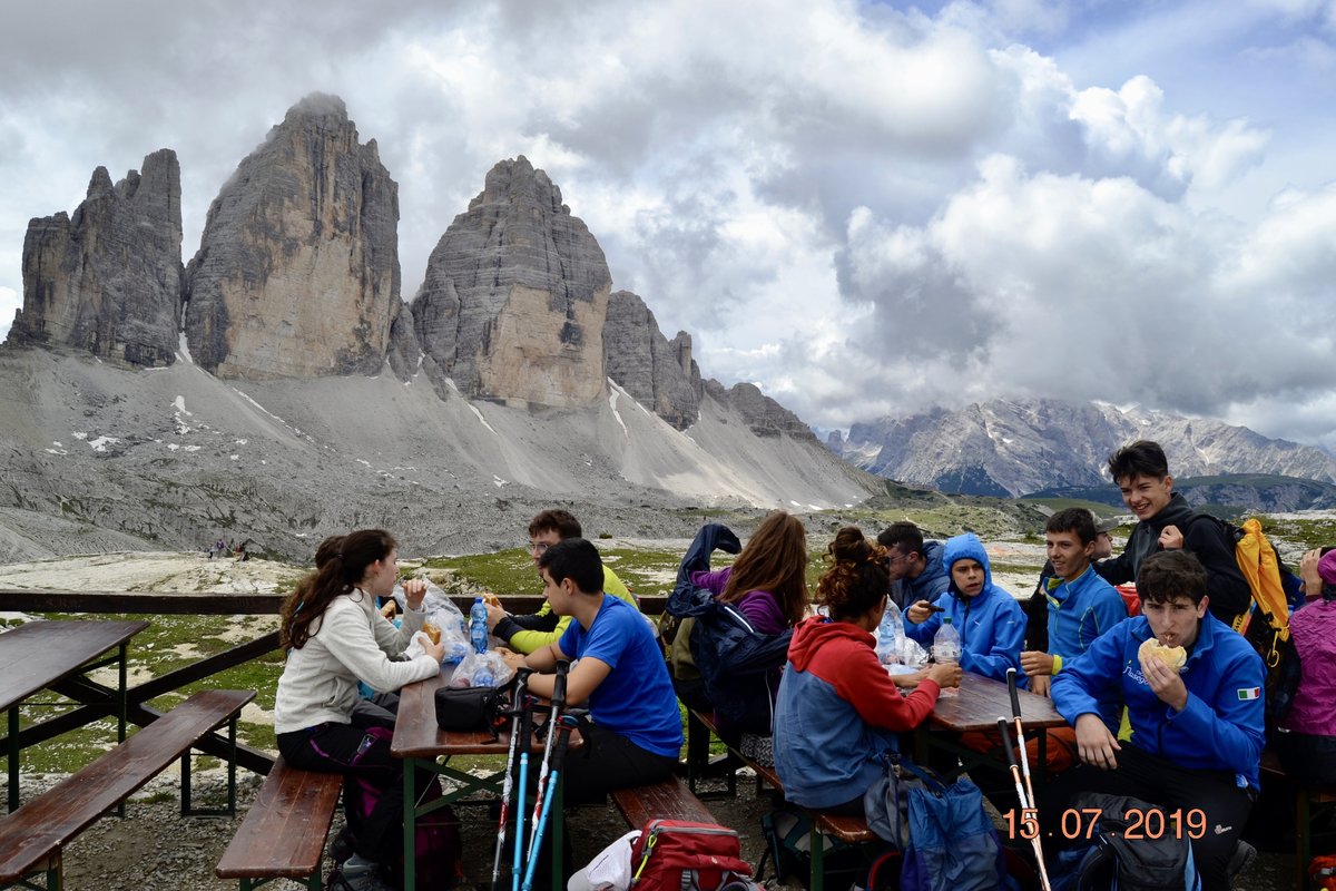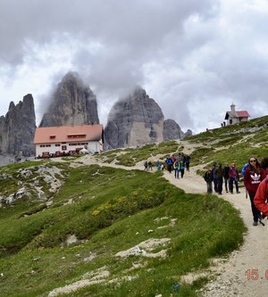 Sveglia alle 6, colazione alle 6.30 per essere veloci all'imbocco del sentiero n. 103, che porta dopo altri 900 metri al rifugio Comici dove, beati loro, hanno dormito i ragazzi del gruppo Base. Via ora sulle tracce dei più giovani sul sentiero 101 che ci porta, con altri 500 metri di dislivello, al rifugio Locatelli. L'ultima erta provoca qualche mugugno, ma giunti al colle le voci tacciono di fronte alla maestosità delle Tre Mammelle (Die Drei Zinnen).
