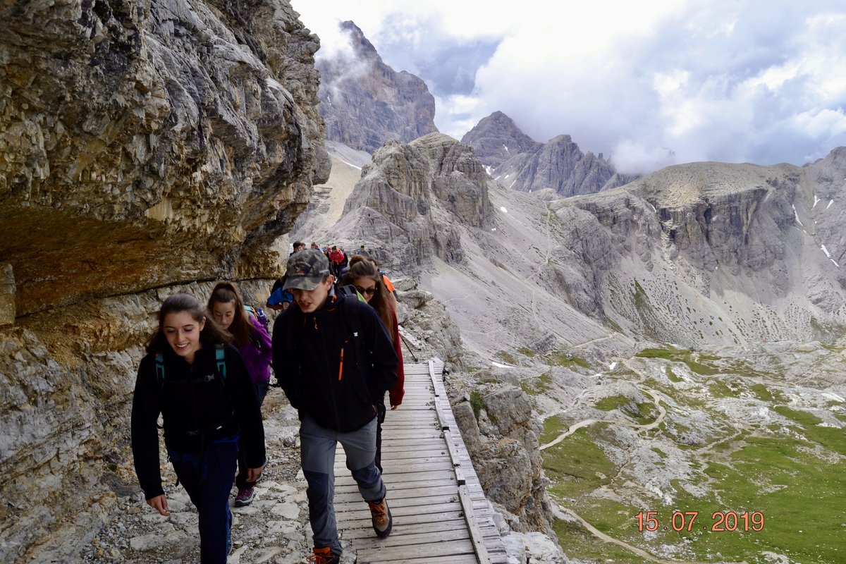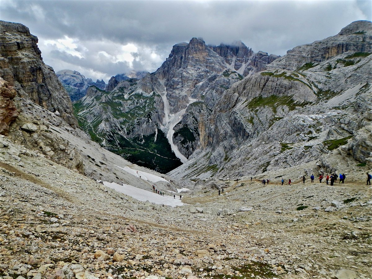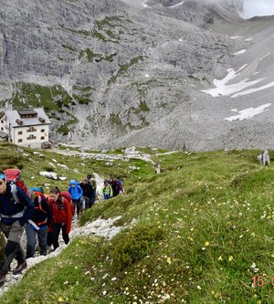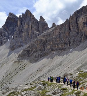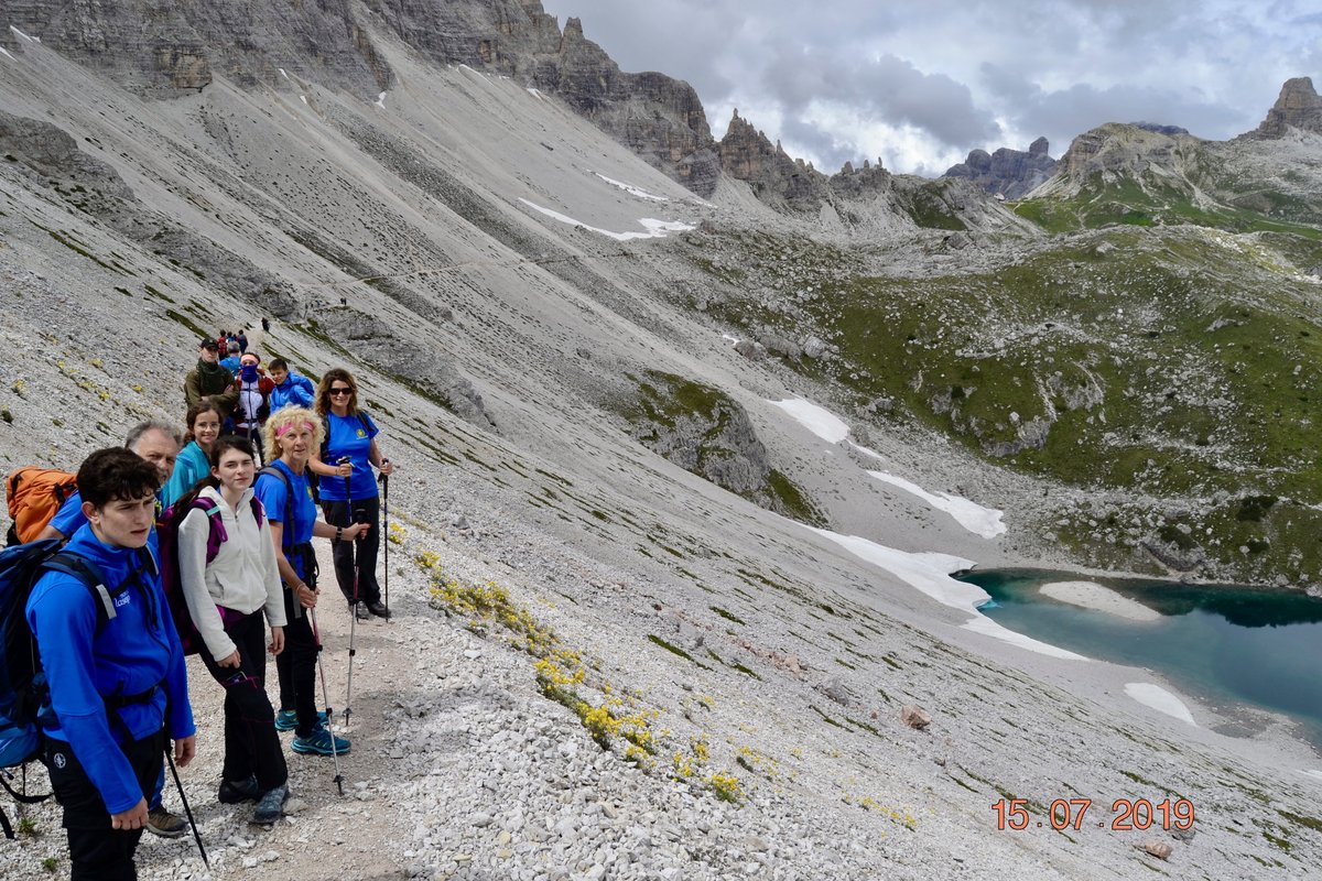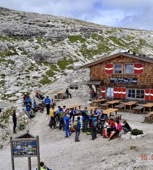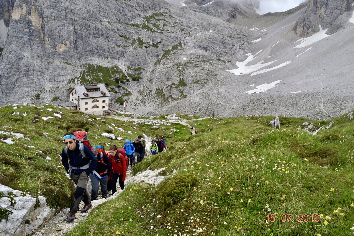 Sveglia alle 6, colazione alle 6.30 per essere veloci all'imbocco del sentiero n. 103, che porta dopo altri 900 metri al rifugio Comici dove, beati loro, hanno dormito i ragazzi del gruppo Base. Via ora sulle tracce dei più giovani sul sentiero 101 che ci porta, con altri 500 metri di dislivello, al rifugio Locatelli. L'ultima erta provoca qualche mugugno, ma giunti al colle le voci tacciono di fronte alla maestosità delle Tre Mammelle (Die Drei Zinnen).