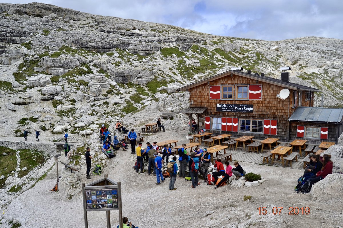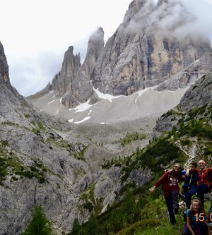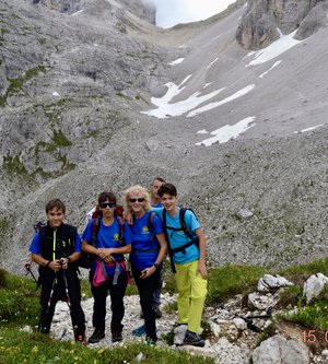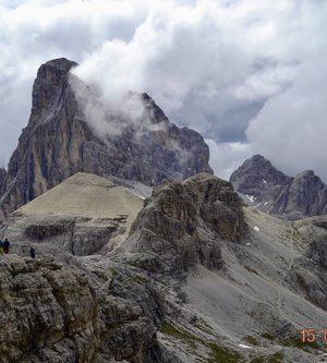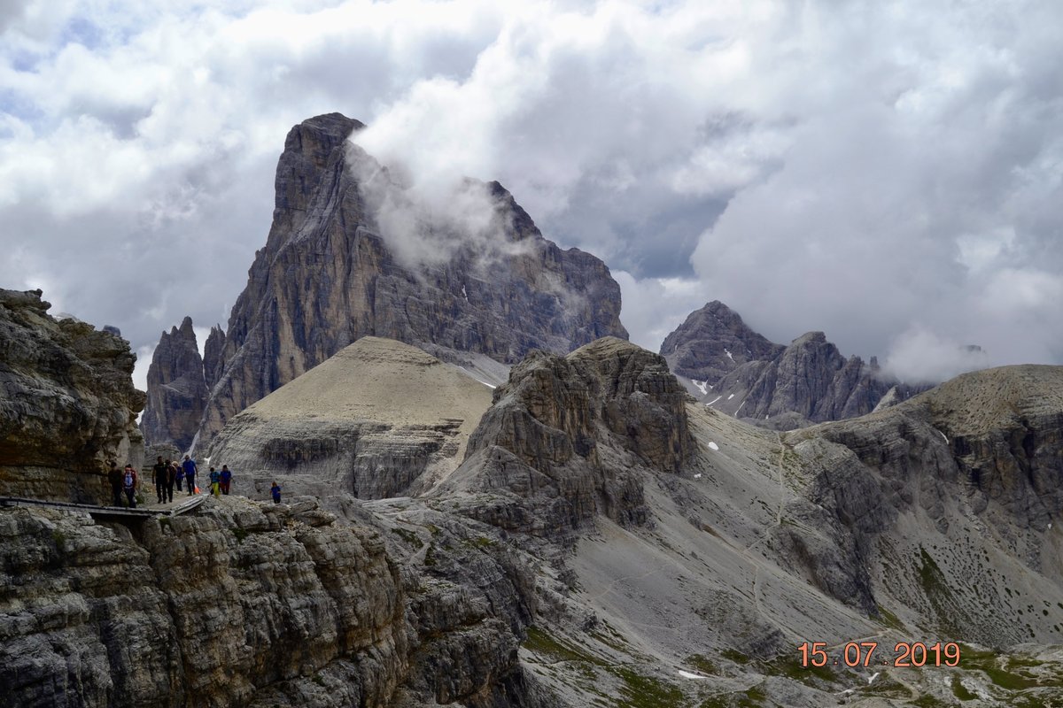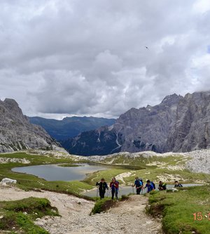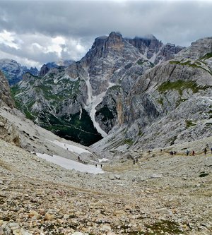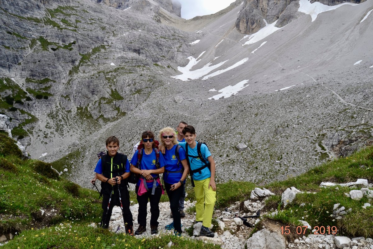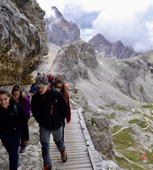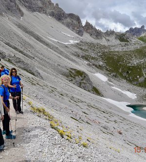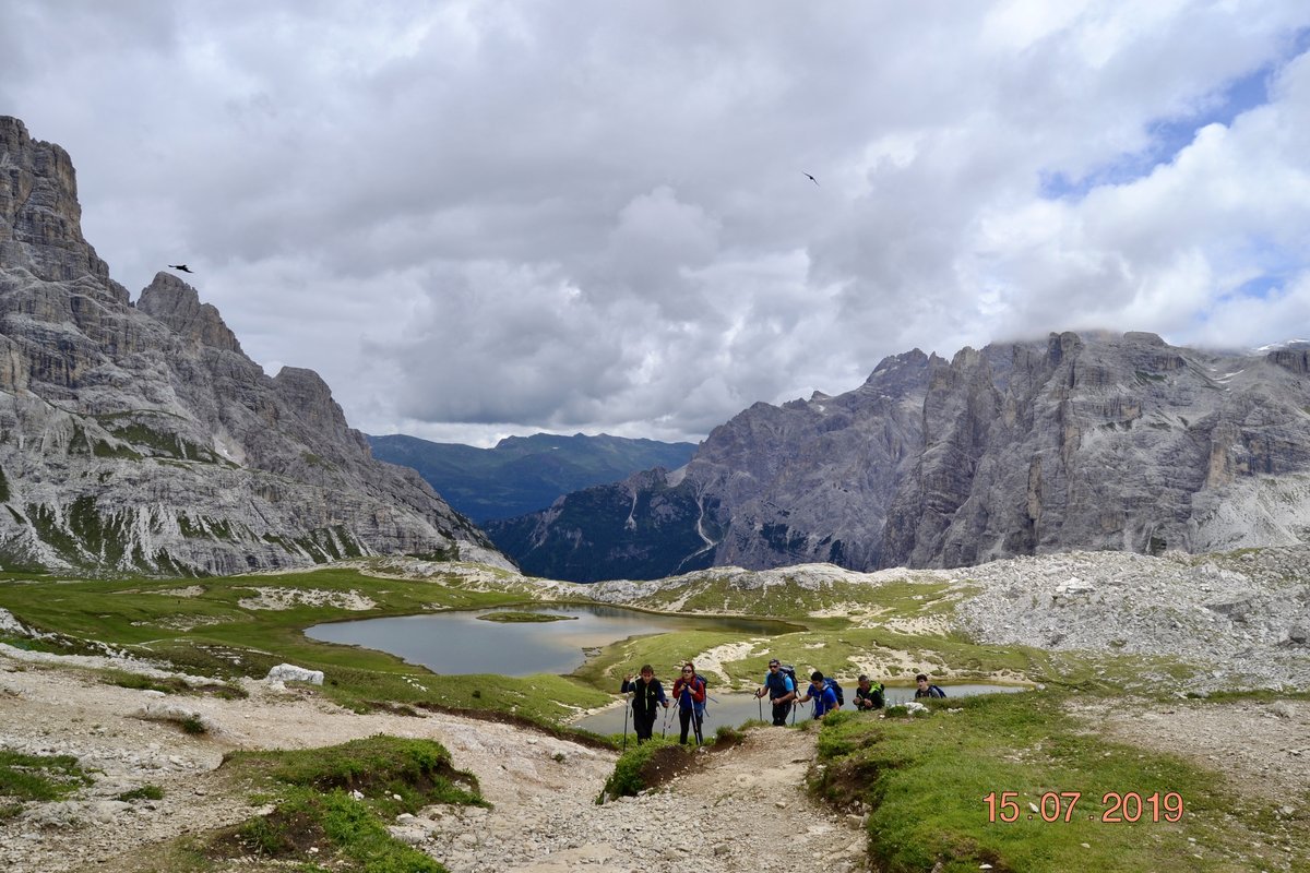 Sveglia alle 6, colazione alle 6.30 per essere veloci all'imbocco del sentiero n. 103, che porta dopo altri 900 metri al rifugio Comici dove, beati loro, hanno dormito i ragazzi del gruppo Base. Via ora sulle tracce dei più giovani sul sentiero 101 che ci porta, con altri 500 metri di dislivello, al rifugio Locatelli. L'ultima erta provoca qualche mugugno, ma giunti al colle le voci tacciono di fronte alla maestosità delle Tre Mammelle (Die Drei Zinnen).